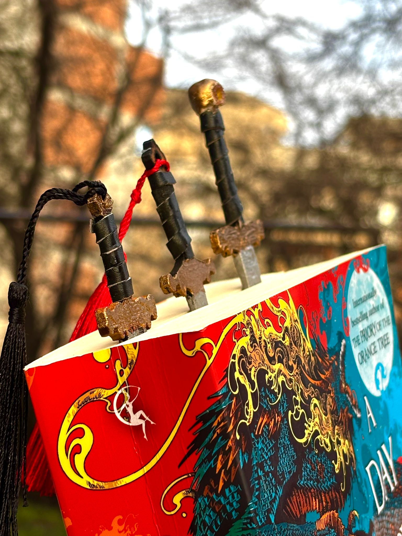 Semn de carte în forma de sabie, realizată din lemn, vopsită manual.