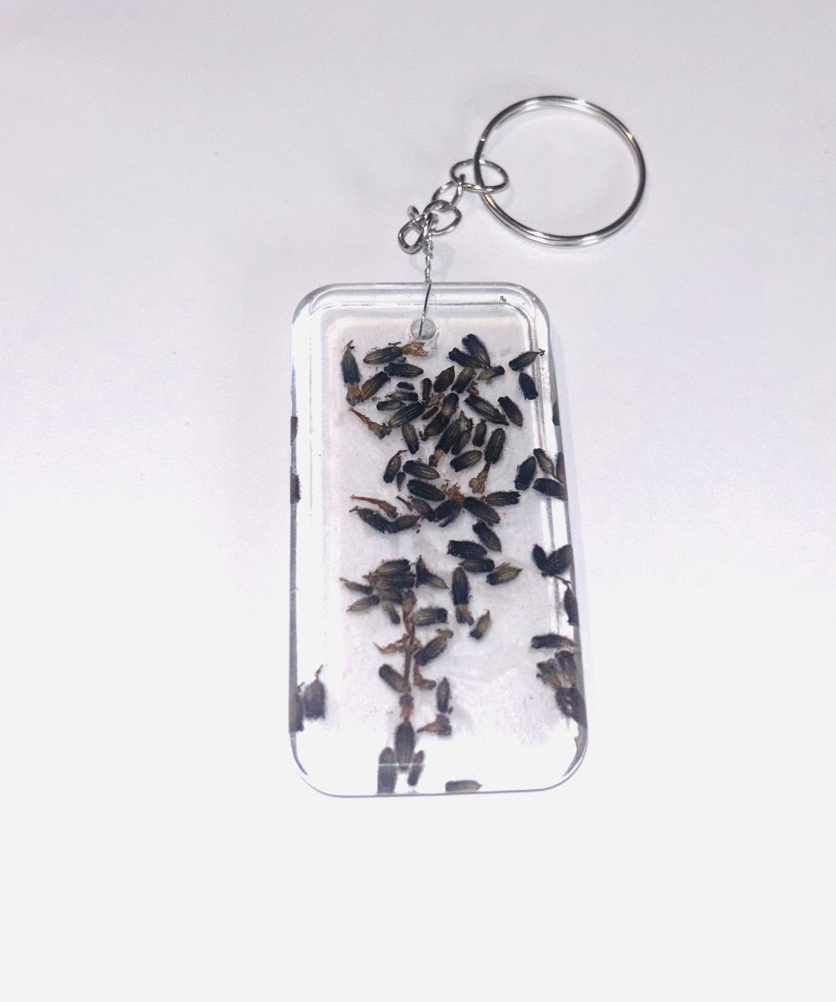 Breloc in forma de amuleta, din rasina epoxidica, cu flori de lavanda.
