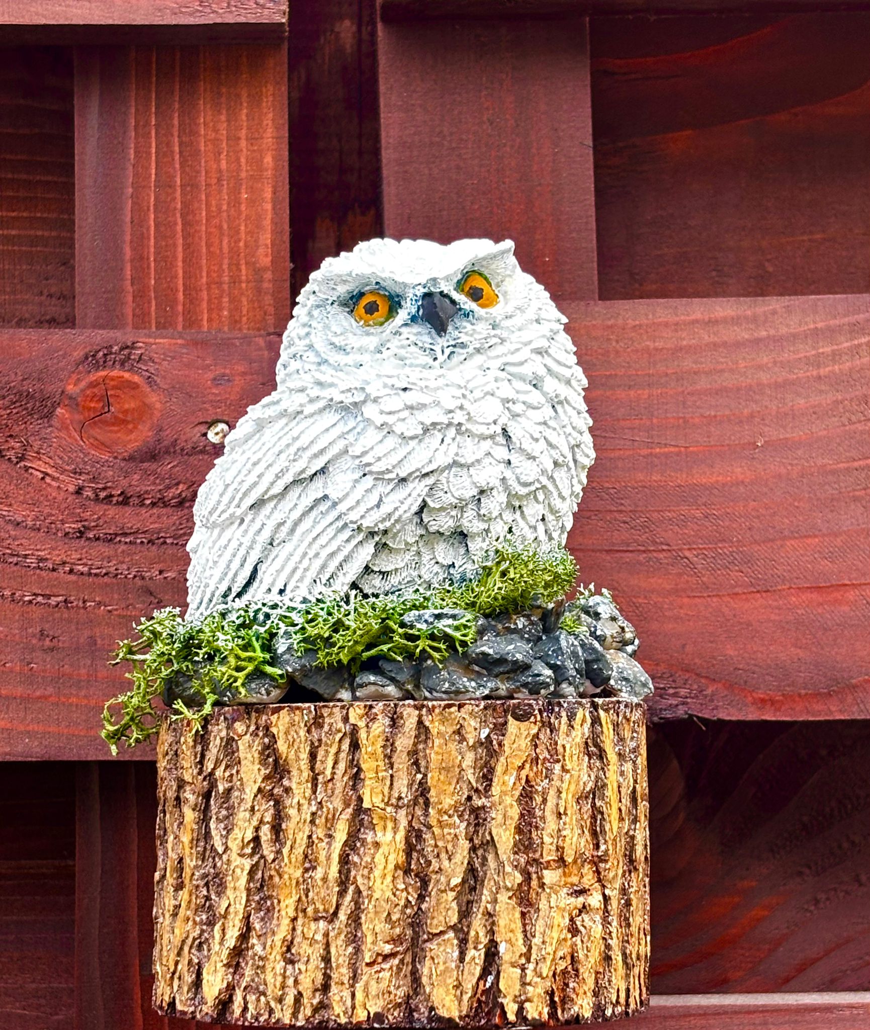 Figurina este confecționată din rășină epoxidică, atent turnată și pictată manual, detaliile fine evidențiind textura penajului și expresivitatea bufniței. Baza este realizată din lemn natural, decorată cu mușchi stabilizat și pietre decorative, ce creează o mică scenă naturală, plină de farmec.