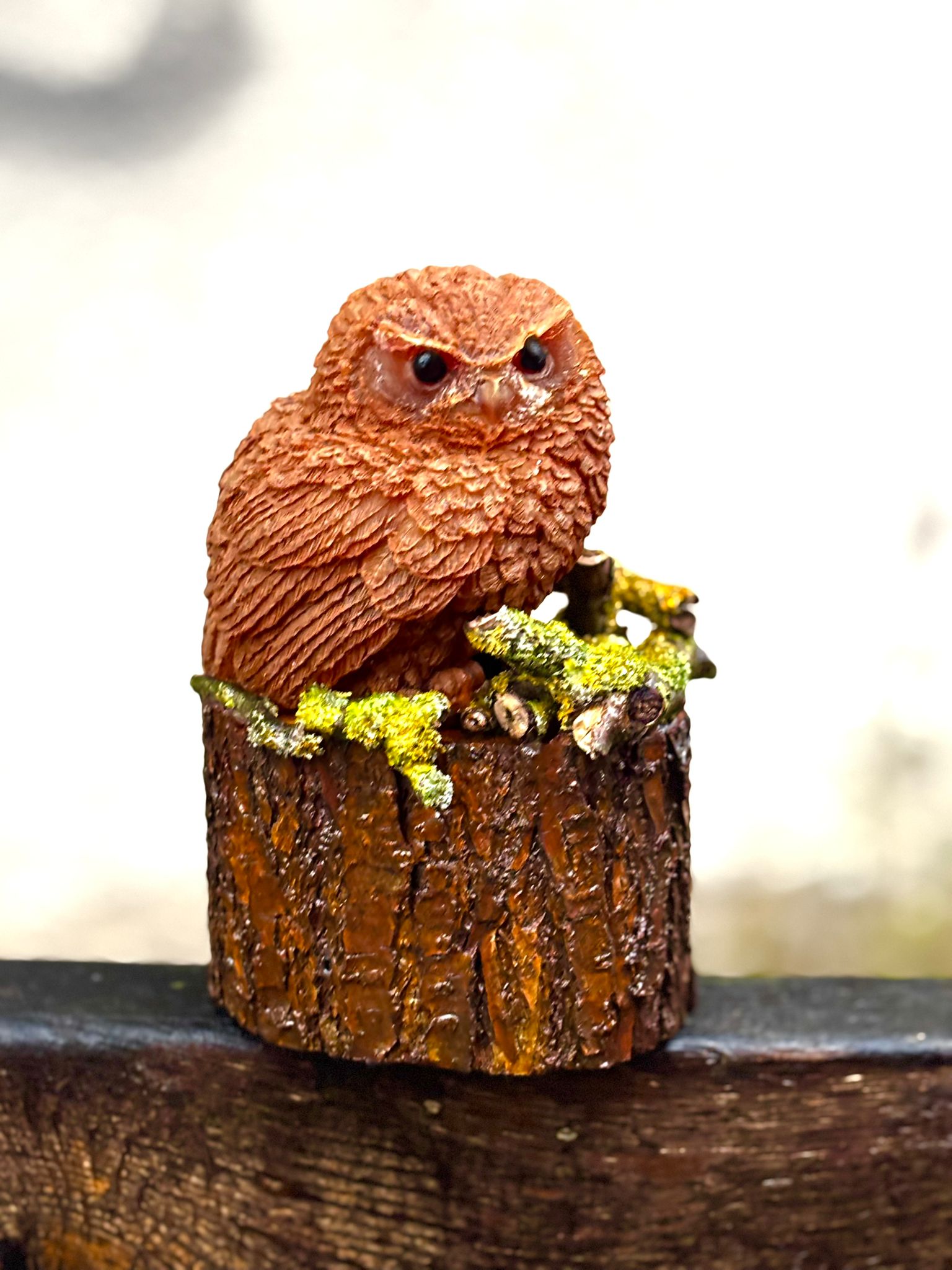 Decor pentru biblioteca alcatuit din lemn de prun lacuit, bufnita din rasina epoxidica si crengute cu muschi verde. Piesa are 810 grame, deci poate fi folosita si ca opritor de carti pe raft.